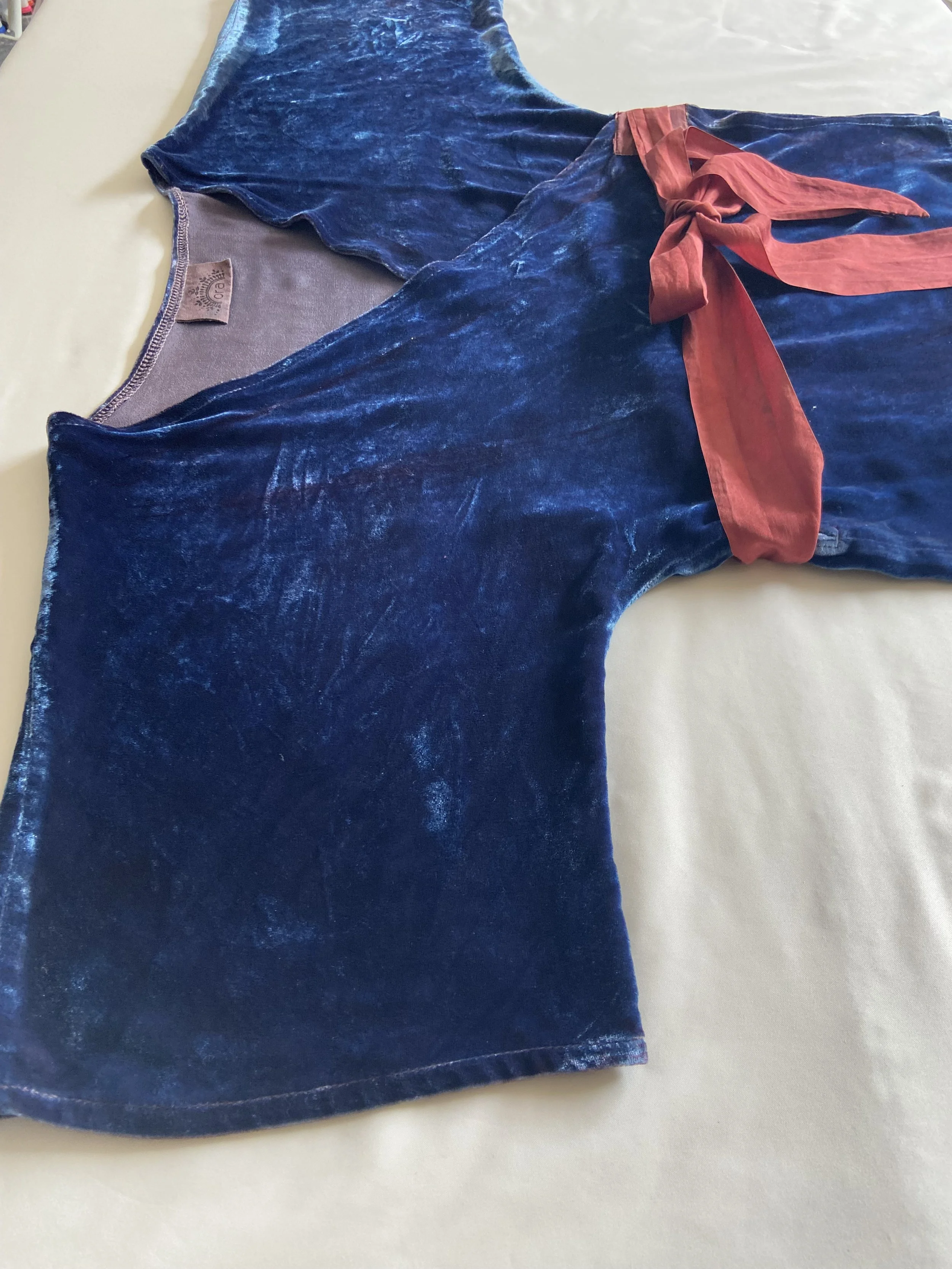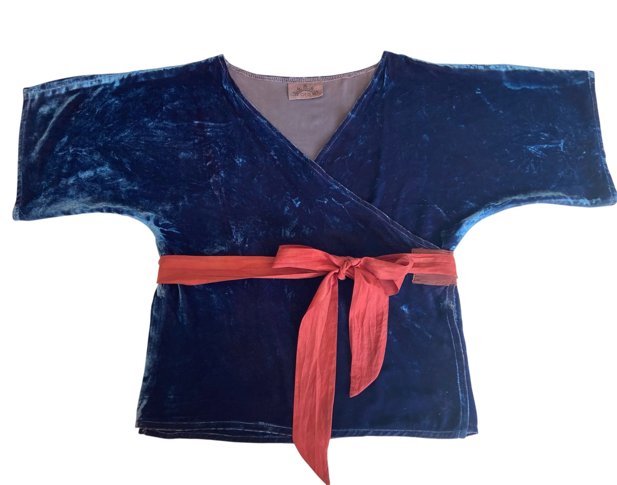 This eco-luxurious plant-dyed silk velvet wrap top is soft and plush, draping beautifully over the body. Its loose kimono sleeves offer effortless comfort and graceful movement, while a lightweight crepe silk tie adds subtle texture and a flattering finish.